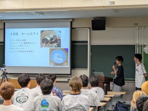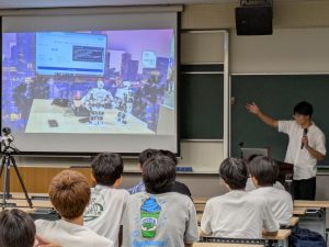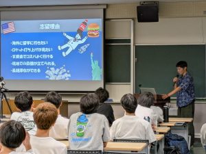 また、「トビタテ!留学JAPAN 新・日本代表プログラム」の高校生等対象(10期)に採用されアメリカ合衆国に留学した板橋葉月さん(機械工学科3年)、岡田和也さん(機械工学科3年)から、留学をしようと思ったきっかけや、受入先での成果、留学先での生活についての報告がありました。