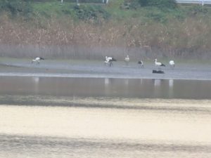 渡良瀬遊水地では、その歴史や治水・利水機能について学び、ラムサール条約登録湿地としての生物多様性の豊かさを実感しました。渡良瀬遊水地には特別天然記念物に指定されているコウノトリの生育環境保全にも取り組んでおり、当日は渡良瀬遊水地や多々良沼でコウノトリの群れを観察することもできました(写真参照)。加えて、現在の遊水地に至る歴史的経緯や利水機能、貴重なヨシ原のはたらきと保全について、本校の水辺(正観寺沼=西湖)環境とも関連づけて学ぶこともできました。その他にもトビ、ハヤブサなどの猛禽類やオオバン、カンムリカイツブリ、カモ類などの水鳥も観察することができました。ゴマやカラメルのような香りがする葉についての紹介もあるなど、参加者の興味を引きました。