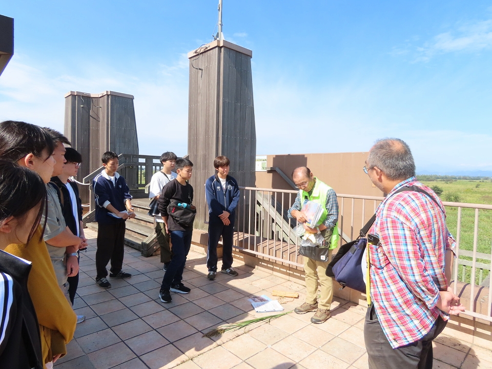 渡良瀬遊水地では、その歴史や治水・利水機能について学び、ラムサール条約登録湿地としての生物多様性の豊かさを実感しました。渡良瀬遊水地には特別天然記念物に指定されているコウノトリの生育環境保全にも取り組んでおり、当日は渡良瀬遊水地や多々良沼でコウノトリの群れを観察することもできました(写真参照)。加えて、現在の遊水地に至る歴史的経緯や利水機能、貴重なヨシ原のはたらきと保全について、本校の水辺(正観寺沼=西湖)環境とも関連づけて学ぶこともできました。その他にもトビ、ハヤブサなどの猛禽類やオオバン、カンムリカイツブリ、カモ類などの水鳥も観察することができました。ゴマやカラメルのような香りがする葉についての紹介もあるなど、参加者の興味を引きました。