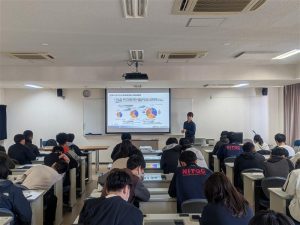令和7年12月9日(火)に半導体産業に関するキャリア講演会が開催されました。本講演会は電子情報工学科の3年生を対象とし、JEITA(電子情報技術産業協会)会員企業であるルネサスエレクトロニクス株式会社様及びSEAJ(日本半導体製造装置協会)会員企業である東京エレクトロン株式会社様のご協力のもと、学生達に向けて半導体産業に関する基調講演並びに本校卒業生による体験談をお話しいただきました。