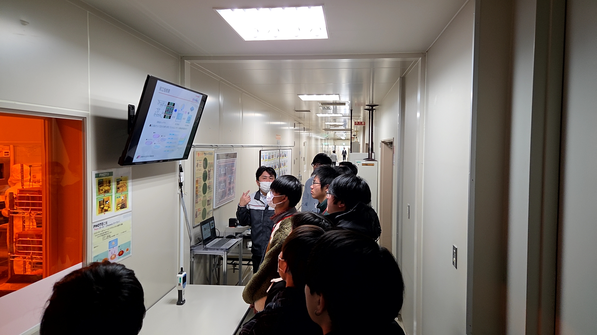 当日は、午前・午後の二部構成で実施されました。午前は、前工程と呼ばれる半導体集積回路の製造工程について見学を行いました。はじめに、クリーンルームとはどのような設備であり、なぜ半導体製造において厳密な環境管理が必要とされるのかについて説明を受けました。その後、ウエハー上に回路を形成する工程や、製造後の特性を確認するウエハーテスト工程について説明を受け、半導体が製品として完成するまでの流れを学びました。これらを通して、微細な集積回路を製造する工程や、安定した品質を確保するための管理体制の重要性について理解を深める機会となりました。