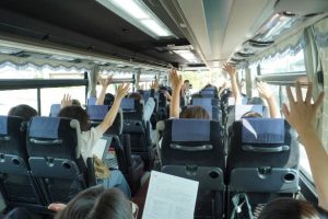 はじめは緊張した雰囲気もありましたが、バスが出発すると、車内では案内人の大澤さんのお話がはじまり、「理学」「工学」の違いは何か、など、興味を引かれる内容で場を和ませてくださいました。